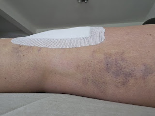 | Bloeduitstorting buitenzijde bovenbeen. In de loop van de week trok dit naar beneden richting kuit en ook scheenbeen. |