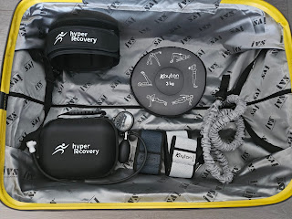 … m’n BFR-band, gewichtzak (oeh, daar gaat 3 kg van m’n bagage) en elastieken.
